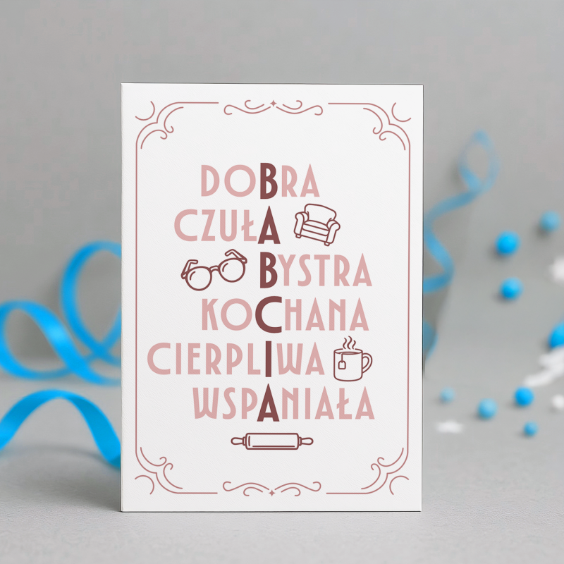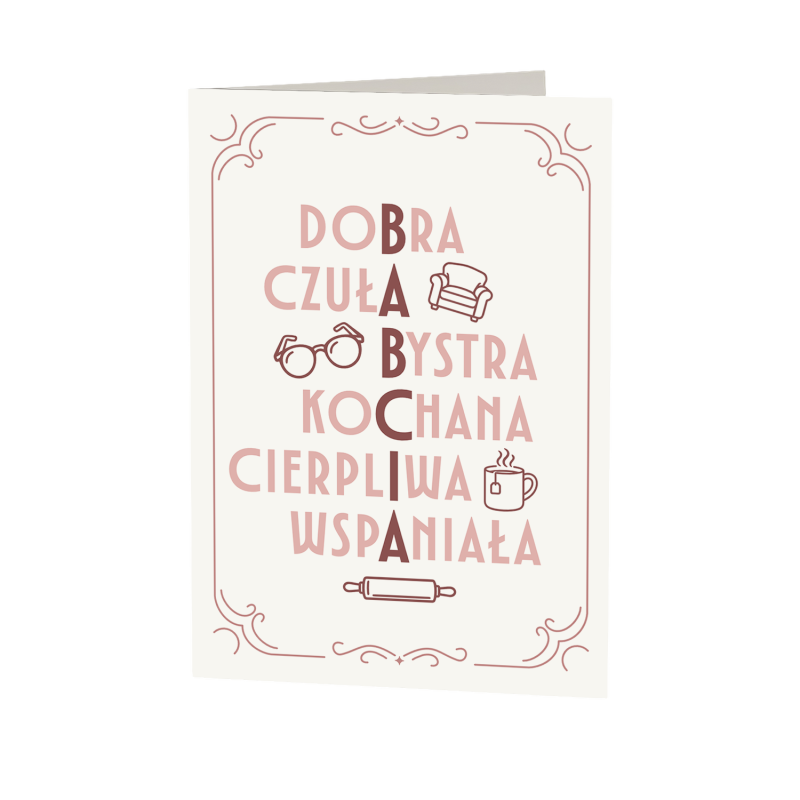 Kartka okolicznościowa na prezent dla babci. Wykonana z wysokiej jakości papieru o eleganckiej fakturze. Doskonała do złożenia życzeń w wyjątkowy sposób — możesz wpisać własne słowa w środku. Spraw, by Twoje życzenia zostały zapamiętane. W zestawie kartka i koperta. Wymiary: 10x15cm.