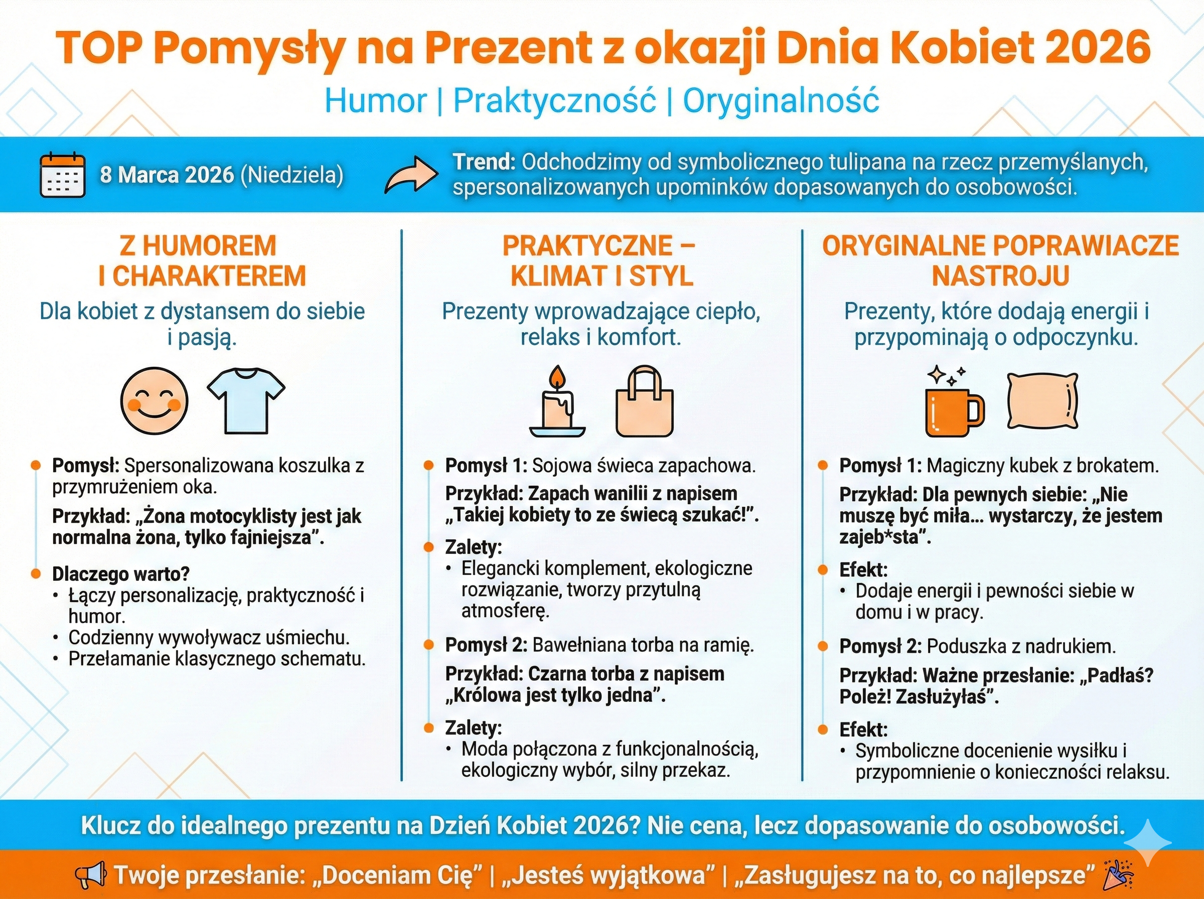 Właśnie dlatego przygotowaliśmy rozszerzony ranking TOP pomysłów na prezent z okazji Dnia Kobiet 2026, który łączy humor, praktyczność i oryginalność. Jeśli zastanawiasz się, co kupić na Dzień Kobiet 2026, poniższe inspiracje pomogą Ci wybrać prezent dopasowany do charakteru i stylu obdarowanej osoby.